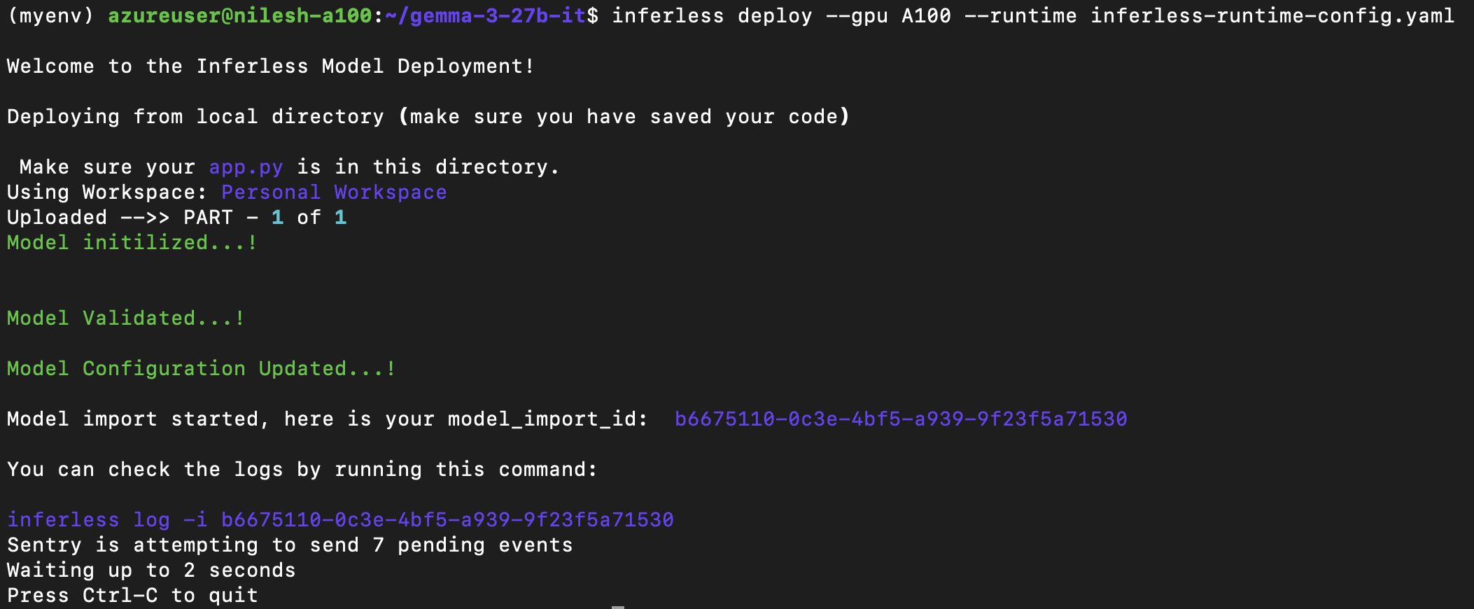 To deploy the model using Inferless CLI, execute the following command:--gpu A100: Specifies the GPU type for deployment. Available options includeA10,A100, andT4.--runtime inferless-runtime-config.yaml: Defines the runtime configuration file. If not specified, the default Inferless runtime is used.