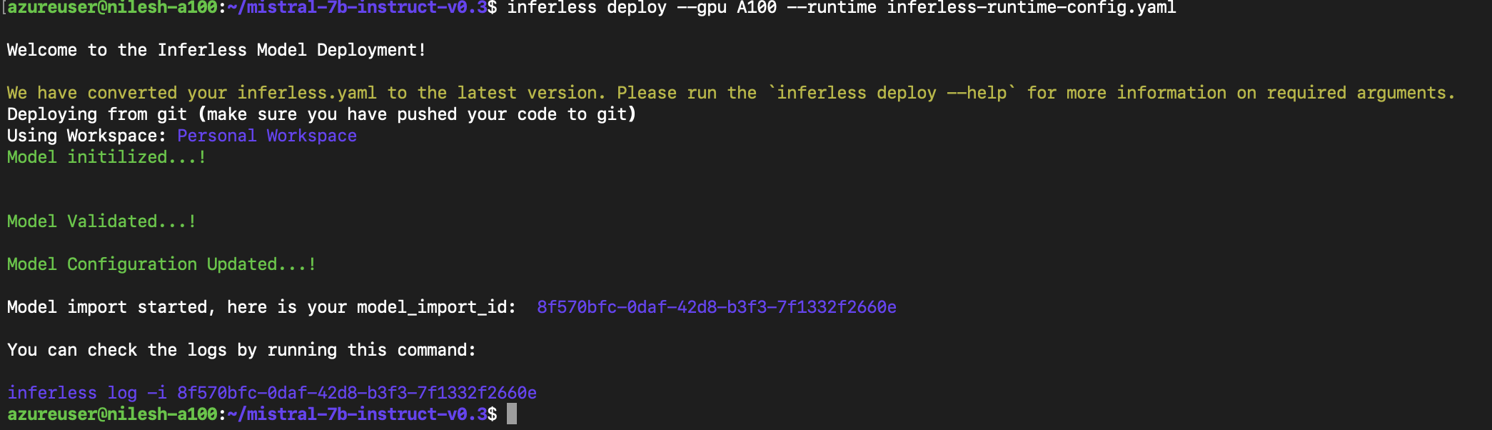 To deploy the model using Inferless CLI, execute the following command:--gpu A100: Specifies the GPU type for deployment. Available options includeA10,A100, andT4.--runtime inferless-runtime-config.yaml: Defines the runtime configuration file. If not specified, the default Inferless runtime is used.