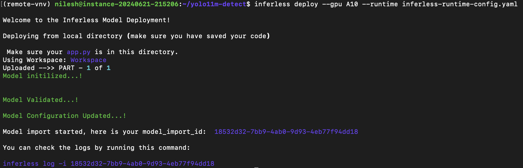 From your local terminal, navigate to the folder containing yourapp.py and your inferless-runtime-config.yaml and run: