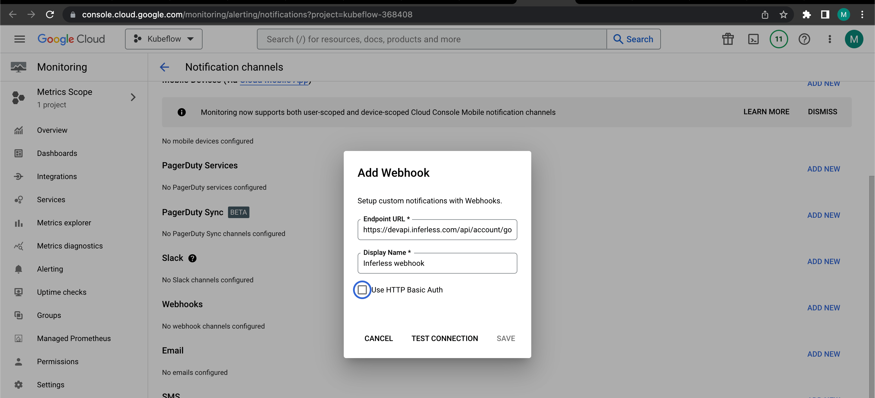 - Create a webhook-based notification channel in the monitoring section.
