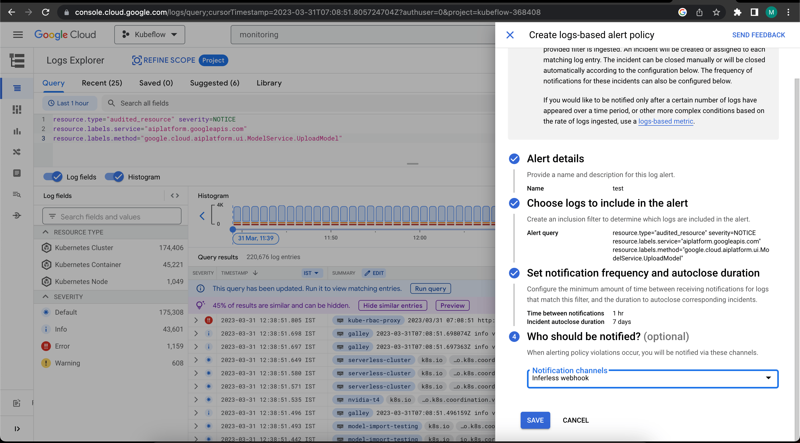 - Create the alert using the webhook channel we created above.